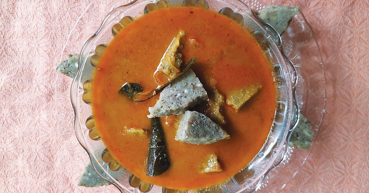 இத்துடன் தேவையான அளவு தண்ணீர் ஊற்றி குழம்புப் பதத்தில் கொதிக்க விடவும். பிறகு வேகவைத்து நறுக்கிய துண்டுகளைக் கலவையில் சேர்க்கவும். கடைசியாக இதனுடன் அரைத்துவைத்துள்ள தேங்காய் மற்றும் முந்திரி விழுதைச் சேர்த்து கொதிக்கவிட்டு இறக்கவும்.