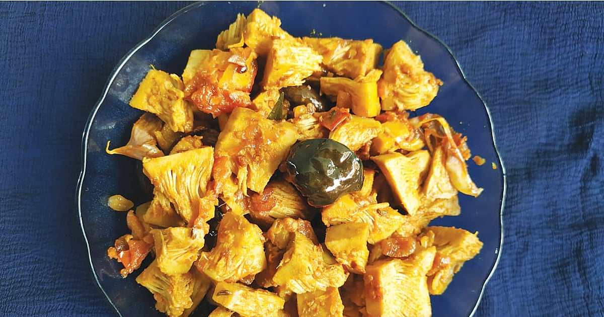 பிறகு அடுப்பைக் குறைவான தீயில் வைத்து எண்ணெய் மிதந்து வரும்வரை கலவையைக் கொதிக்கவிடவும். பின்னர் இதில் வேகவைத்த பலாக்காயைச் சேர்த்து நன்கு கிளறி வாணலியை மூடிவைத்து ஐந்து நிமிடங்கள் சிம்மில் வைத்து இறக்கவும்.