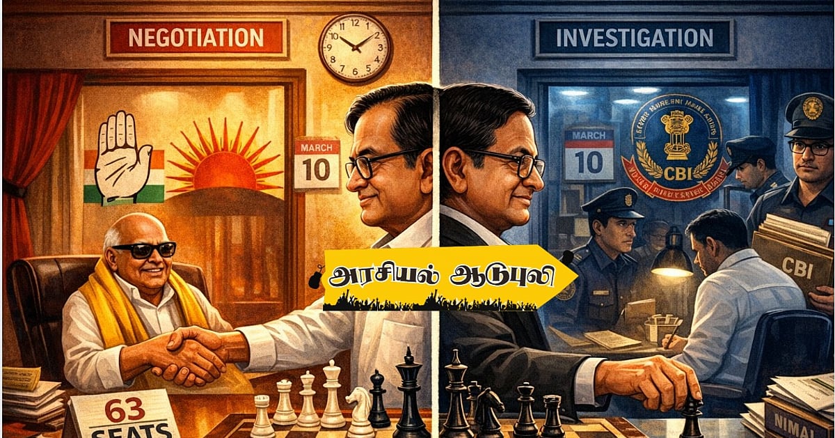 திமுக காங்கிரஸ் கூட்டணிப் பேச்சுவார்த்தையில், காங்கிரஸ் பிரதிநிதியாக ப.சிதம்பரம் இருந்தார். உள்துறை அமைச்சரான ப.சிதம்பரம் தலைமையின் கீழ் செயல்படும் சிபிஐ அதிகாரிகள் இன்னொரு அறையில் திமுக தலைவரின் மனைவி மற்றும் மகளிடம் விசாரணை நடத்திக் கொண்டிருந்தனர்.