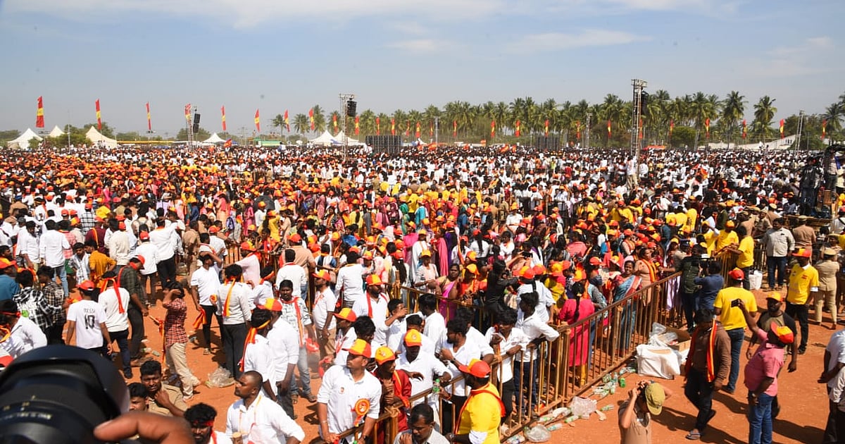 வியாழக்கிழமை காலை 8 மணிக்கு மேல் தொண்டர்கள் மைதானத்துக்கு உள்ளே அனுமதிக்கப்படுவார்கள் என்று தெரிவிக்கப்பட்டிருந்தது. ஆனால், அதிகாலை முதலே தொண்டர்கள் குவிந்ததால், காலை 7 மணி அளவில் உள்ளே அனுமதிக்கப்பட்டனர். காலை 10 மணி முதல் பிற்பகல் 1 வரை கூட்டத்துக்கு அனுமதி அளித்திருந்த நிலையில், தவெக தலைவர் விஜய் 11.30 மணிக்கு கூட்டம் நடைபெறும் இடத்துக்கு வருவார் என்று சொல்லப்பட்டிருந்தது. சுமார் 11.40 அளவில் பிரசாரக் கூட்ட மேடைக்கு விஜய் வருகை தந்தார். விஜய் பிரசாரக் கூட்டத்துக்கு வந்தவுடன் கூட்டத்தில் இருந்த இளைஞர்கள் அவரைப் பார்க்கும் ஆர்வத்துடன், கேபினின் இரும்புக் கம்பிகள் மீது ஏறத் தொடங்கினர். இதையடுத்து, காவலர்கள் அவர்களைக் கீழே இறங்குமாறு அறிவுறுத்தினர். சிலர் குடிநீர் கொண்டு வந்த லாரிகள் மீது ஏறி அமர்ந்துகொண்டனர். அவர்களை கீழே இறங்குமாறு அறிவுறுத்தியும் அவர்கள் கீழே இறங்காததால், லாரி மீது ஏறிய காவலர்கள் அவர்களை வலுக்கட்டயமாக கீழே இறக்கிவிட்டனர்.