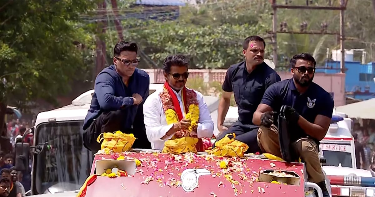 திறந்தநிலை வாகனத்தின் மேலே நின்றபடி, ரசிகர்களைப் பார்த்துக் கையசைத்து சுமார் 4 மணிநேரத்திற்கும் மேலாக விஜய் சாலைப் பயணம் மேற்கொண்டார்.