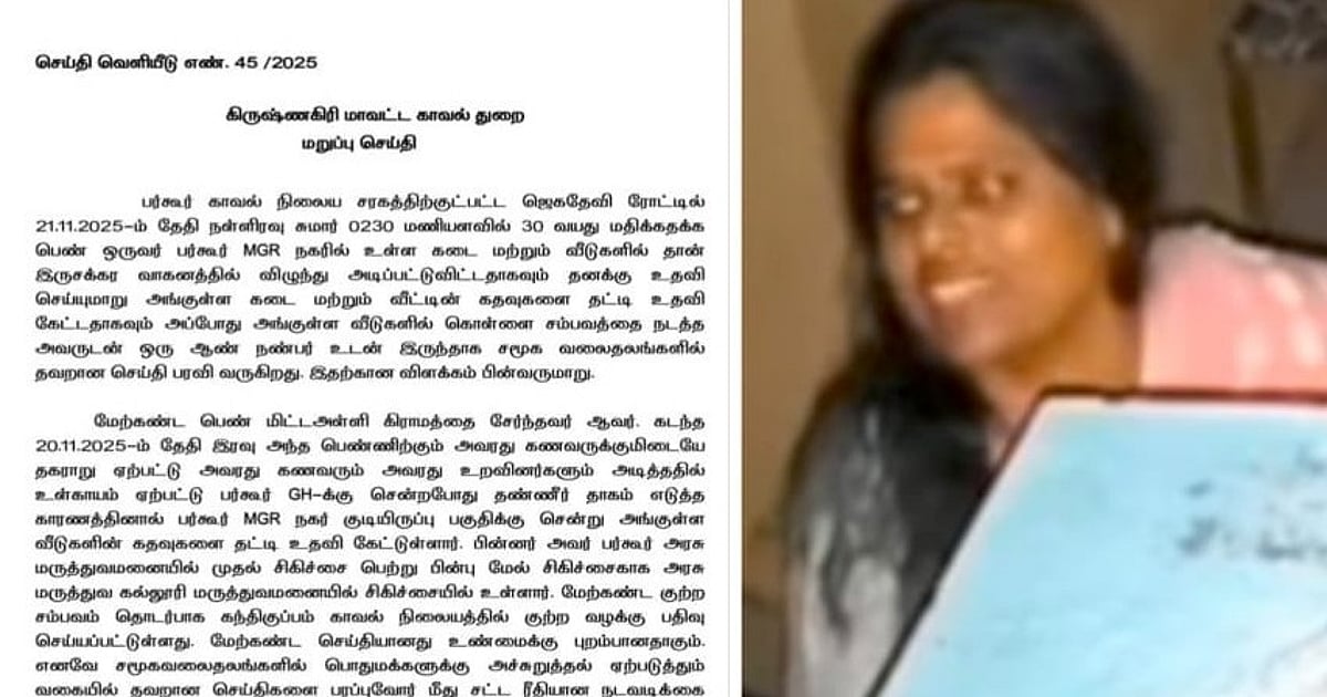 கிருஷ்ணகிரி மாவட்டம், பர்கூர் ஜெகதேவி சாலை, எம்.ஜி.ஆர் நகரில் உள்ள தமிழ்நாடு கிராம வங்கி அருகில் வசிப்பவர் அர்ஜுனன் (வயது 71). விவசாயியான இவர், தனது மனைவியுடன் வசித்து வருகிறார். இந்த நிலையில், நேற்று முன்தினம் நள்ளிரவு 2.30 மணியளவில், 30 வயது மதிக்கத்தக்க பெண் ஒருவர் அர்ஜுனன் வீடு அமைந்திருக்கும் தெருவுக்குள் புகுந்து அவரின் வீட்டு வாசலில் நின்றுகொண்டு, `சார்… சார்… நான் அடிப்பட்டு வந்துருக்கேன் சார். என் பேரு மீனாட்சி. காப்பாத்துங்க, ப்ளீஸ் ஹெல்ப் மீ சார்…’ என சத்தமாக பேசினார்.