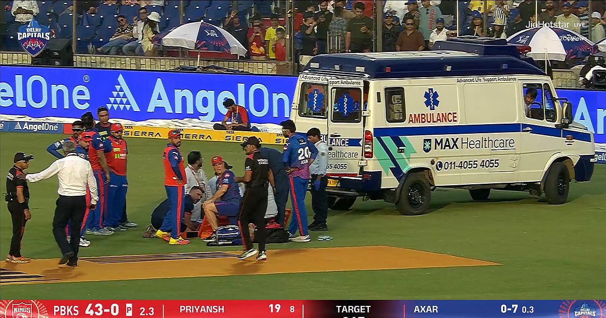 இந்நிலையில், மூன்றாவது ஓவரை டெல்லியின் கேப்டன் அக்சர் படேல் வீசியிருந்தார். இந்த ஓவரில் ஒரு பந்தில் பிரியான்ஸ் ஆர்யா பெரிய ஷாட்டுக்கு முயன்றார். மிட் ஆபில் பீல்டிங் செய்து கொண்டிருந்த லுங்கி இங்கிடி பின்பக்கமாக ஓடிச் சென்று அந்த பந்தை கேட்ச் செய்ய முயன்றார். கேட்ச்சை தவற விட்ட அவர் பின்பக்கமாக தவறி விழுந்தார். அதில் அவரின் கழுத்தும் தலையும் மடங்கி பலத்த அடி வாங்கினர். மைதானத்திலேயே சுருண்டு படுத்த அவரை அணியின் பயிற்சியாளர்களும் மருத்துவர்களும் சோதித்துப் பார்த்தனர்.