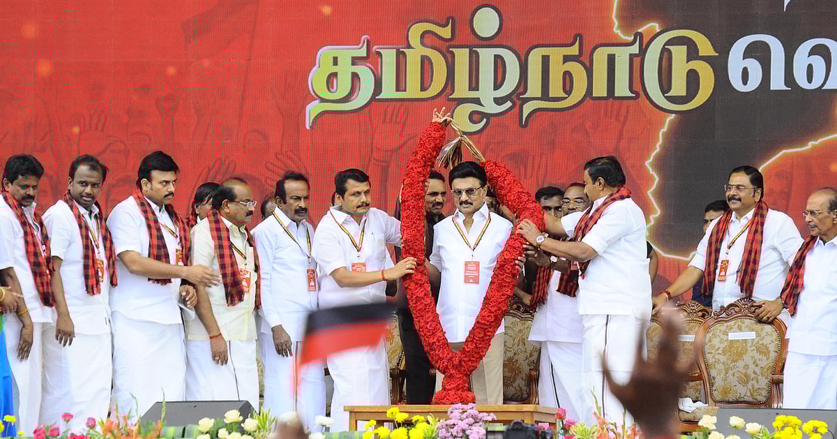கோவையில் என் வாக்கு சாவடி வெற்றி வாக்குச்சாவடி என்ற பெயரில் திமுக மேற்கு மண்டல வாக்குச்சாவடி குழுவினருக்கான பயிற்சி மாநாடு நடந்தது. இதில் கலந்துகொண்ட முதல்வர் ஸ்டாலினுக்கு முன்னாள் அமைச்சர் செந்தில் பாலாஜி உள்ளிட்ட கட்சி நிர்வாகிகள் ஆளுயர மாலை அணிவித்து செங்கோல் வழங்கினர்.