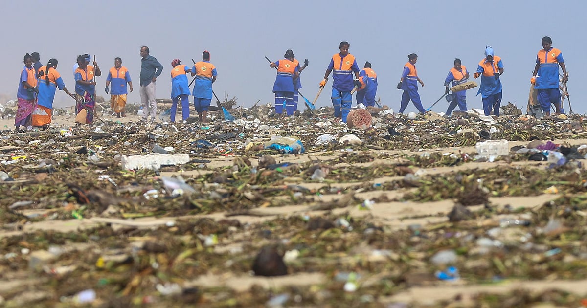 டிட்வா புயலால் அடையாற்றில் ஏற்பட்ட வெள்ளப்பெருக்கினால் அடித்துவரப்பட்ட கழிவுகள் சென்னை பட்டினப்பாக்கம் சீனிவாசபுரம் முகத்துவாரத்தில் குவிந்துள்ளன. ஆகாய தாமரை, பிளாஸ்டிக் கழிவுகளை தூய்மைப் பணியாளர்கள் அகற்றி வருகின்றனர்.