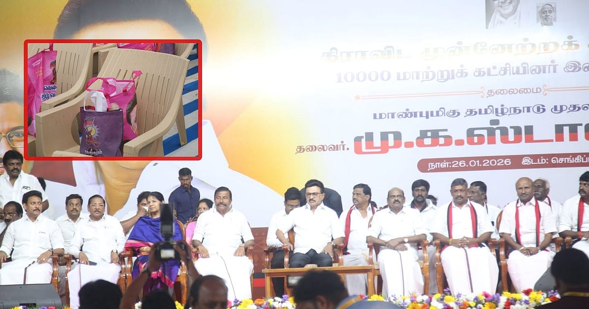 மாநாட்டு திடலில் போடப்பட்டிருக்கும் நாற்காளிகளில் பை ஒன்று வைக்கப்பட்டிருக்கிறது. அந்தப் பையில் சிக்கன் பிரியாணி வைக்கப்பட்ட ஹாட் பாக்ஸ், மேரி கோல்டு, குட் டே பிஸ்கட், பாதுஷா, மிக்சர் காரம், தண்ணீர், மாசா கூல்டிரிங்ஸ் உள்ளிட்டவை இருக்கின்றன.
