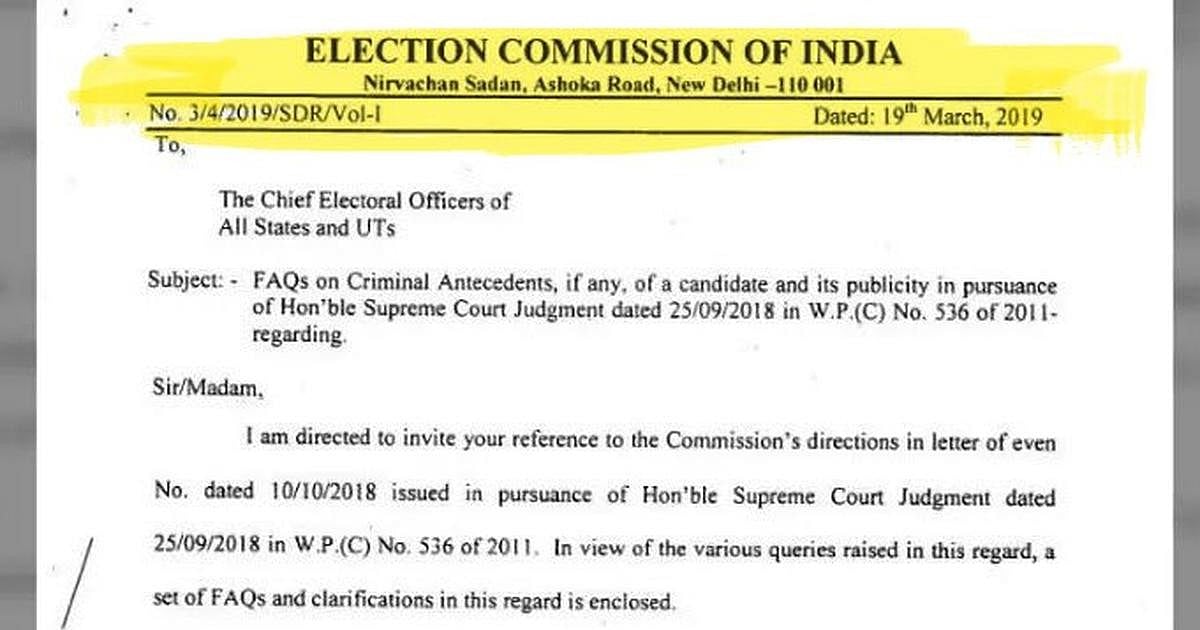 2019-ஆம் ஆண்டு வெளியிடப்பட்ட வேட்பாளர்களின் குற்றப் பின்னணி தொடர்பான வழிகாட்டுதல்கள் குறித்து விளக்கம் கோரி, பாஜக கேரளா அலுவலக தேர்தல் ஆணையத்திடம் கோரிக்கை விடுத்திருந்தது.