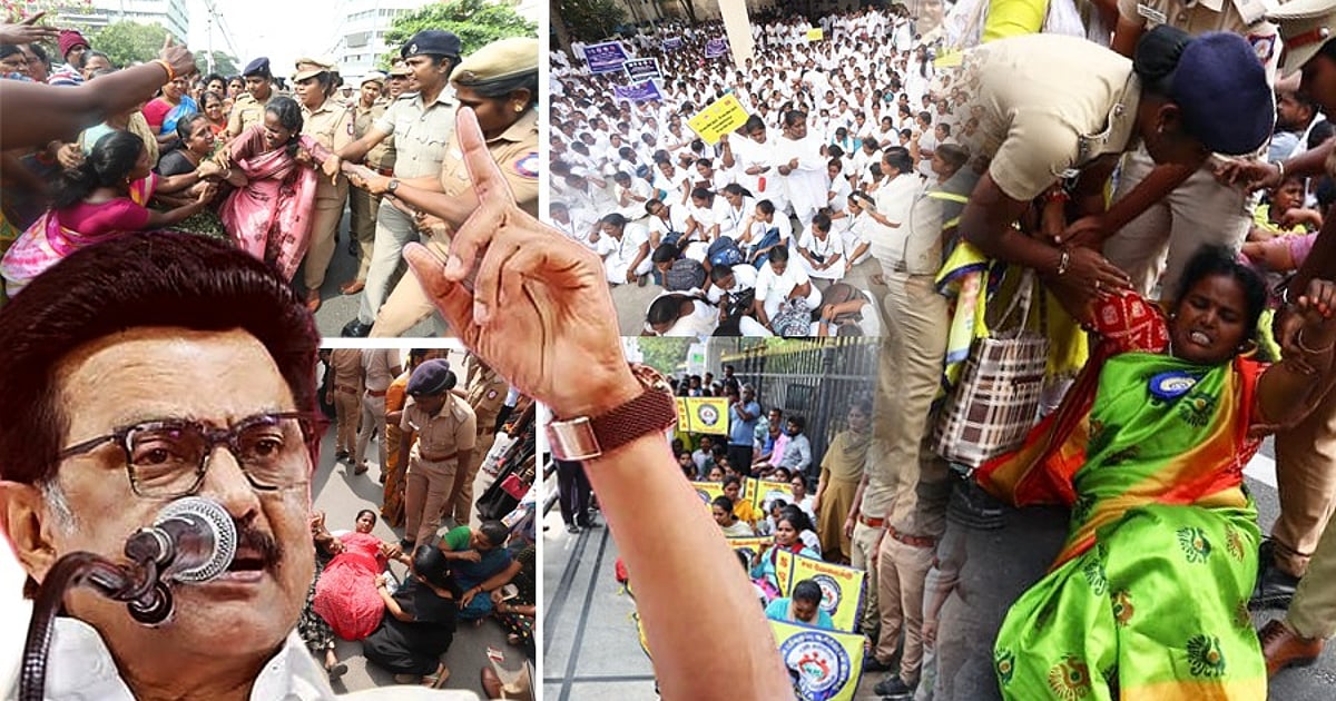 கொரோனா காலத்தில் செவிலியர்களை தேவதூதர்கள் புனிதப்படுத்தியது அரசு. ஆனால், அவர்கள் எதிர்பார்த்தது தங்களை கடவுள் போல வணங்க வேண்டும் என்பதெல்லாம் இல்லை. செய்கிற வேலைக்கு முறையான சம்பளமும், பணி நிரந்தரமும் மட்டுமே கேட்டனர். அதுவும் அரசுக்கு தெரியாததெல்லாம் அல்ல. வாக்குறுதி 356 இல் அரசு மருத்துவமனைகளில் காலிப்பணியிடங்கள் நிரப்பப்படும். ஒப்பந்த மருத்துவர்களும் செவிலியர்களும் பணி நிரந்தரம் செய்யப்படுவர் எனக் கூறியிருந்தது திமுக. அதை முன்வைத்துதான் கடந்த வாரத்தில் சிவானந்தம் சாலையில் செவிலியர்கள் போராட்டத்தை முன்னெடுத்தனர். அவர்களை குண்டுக்கட்டாக கைது செய்து பேருந்தில் வைத்து பல மணி நேரங்கள் சுற்றி கிளாம்பாக்கத்தில் அம்போவென இறக்கிவிட்டனர்.