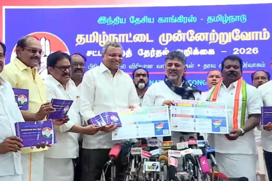 தமிழக சட்டப்பேரவையில் 28 தொகுதிகளில் போட்டியிடும் காங்கிரஸ் கட்சியின் தேர்தல் அறிக்கையை, கர்நாடக துணை முதல்வர் டி.கே. சிவக்குமார் வெளியிட்டார். 10 தலைப்புகளைக் கொண்ட தேர்தல் வாக்குறுதி வெளியாகியிருக்கிறது.காங்கிரஸ் தேர்தல் அறிக்கையில் இடம் பெற்றுள்ள சில முக்கிய அம்சங்கள் வருமாறு: