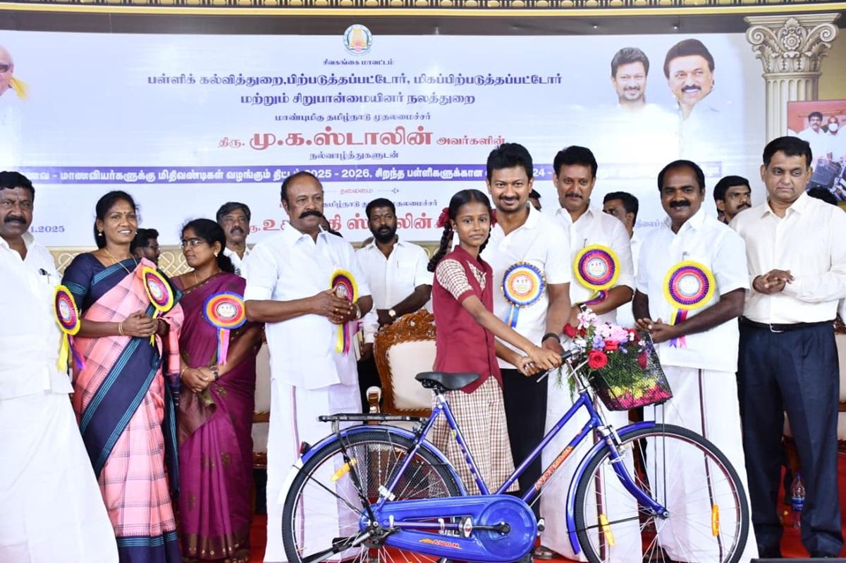 சிவகங்கை மாவட்டம் காரைக்குடி அழகப்பா மாதிரி பள்ளி வளாகத்தில் பிளஸ் 1 மாணவிகளுக்கு இலவச சைக்கிள்கள் வழங்குதல், சிறந்த பள்ளிகளுக்கு விருதுகள் வழங்குதல், குழந்தைகள் தினம் ஆகிய முப்பெரும் விழா நடைபெற்றது.