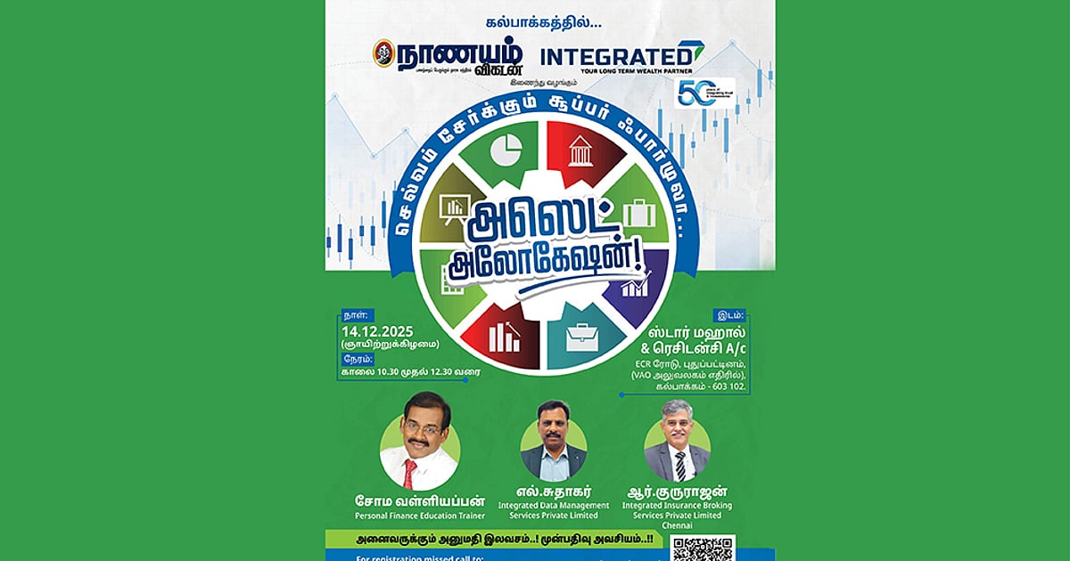 Spread the love நாணயம் விகடன் & இன்டக்ரேட்டட் இணைந்து நடத்தும் ‘செல்வம் சேர்க்கும் சூப்பர் ஃபார்முலா… அஸெட் அலொகேஷன்!’ சிறப்பு நிகழ்ச்சி, கல்பாக்கத்தில் டிசம்பர் 14, ஞாயிற்றுக்கிழமை, காலை 10.30 முதல் மதியம் […]
