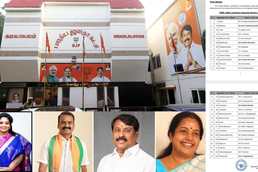 பாஜக வேட்பாளர் பட்டியல்: ஆவடி ராஜசிம்ம மகிந்திரா, மயிலாப்பூர் தமிழிசை சௌந்தரராஜன், தளி டாக்டர் நாகேஷ் குமார், திருவண்ணாமலை சி. ஏழுமலை, ராசிபுரம் (தனி) – டாக்டர் எஸ்டி பிரேம்குமார், மொடக்குறிச்சி – கிருத்திகா சிவக்குமார், உதகை – போஜ ராஜன், அவினாசி (தனி) எல். முருகன், திருப்பூர் தெற்கு தங்கராஜ், கோவை வடக்கு-வானதி சீனிவாசன், திருவாரூர் – கோவி சந்துர், தஞ்சை எம். முருகானந்தம் ஆகியோர் போட்டியிடுவார்கள் என்று அறிவிக்கப்பட்டுள்ளது.