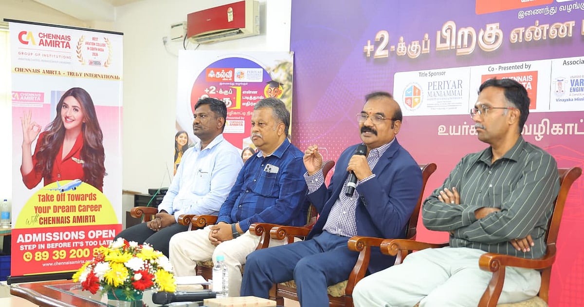 இந்தக் குழப்பங்களுக்கு முற்றுப்புள்ளி வைக்கவும், எதிர்காலப் பாதையைத் திட்டமிடவும் கல்வி விகடன் மற்றும் பெரியார் மணியம்மை அறிவியல் மற்றும் தொழில்நுட்ப நிறுவனம் இணைந்து நடத்திய வழிகாட்டி முகாம் சென்னையில் சீரோடும் சிறப்போடும் இன்று (25.04.2026) நடைபெற்றது.
