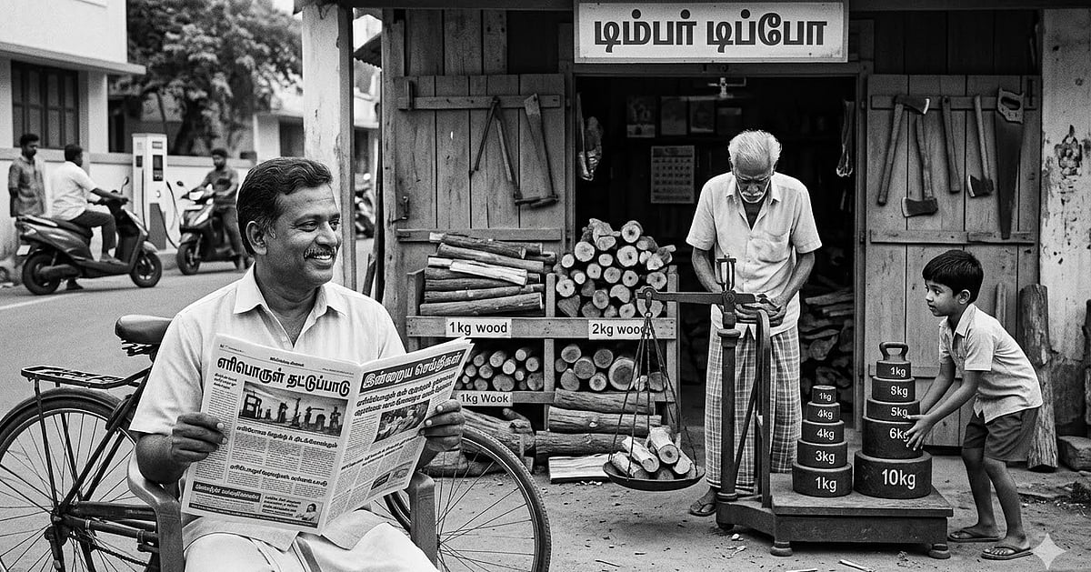 ஒடிசலான தேகம் அவருக்கு. ஆனால் அசால்ட்டாக எவ்வளவு மரக்கட்டைகளை வேண்டுமானாலும் எடுத்து வந்து தராசு தட்டில் வைத்து எடை போட்டுத் தருவார்..