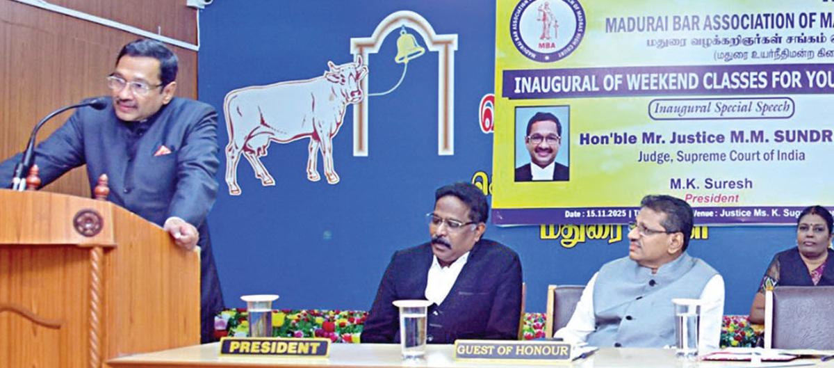 உயர் நீதிமன்ற மதுரை அமர்வு வழக்கறிஞர்கள் சங்கம் (எம்பிஏ) சார்பில், நீதித்துறை தேர்வுக்குத் தயாராகி வரும் இளம் வழக்கறிஞர்களுக்கான வார இறுதி நாள் பயிற்சி வகுப்பு தொடக்க விழா நேற்று நடைபெற்றது. சங்கத் தலைவர் எம்.கே.சுரேஷ் தலைமை வகித்தார். செயலர் ஆர்.வெங்கடேசன் வரவேற்றார். பயிற்சி வகுப்பைத் தொடங்கிவைத்து உச்ச நீதிமன்ற நீதிபதி எம்.எம்.சுந்தரேஷ் பேசியதாவது: கீழமை நீதிமன்றம், உயர் நீதிமன்றம் என்று பிரித்துப் பார்க்காமல், அனைத்தையும் நீதி வழங்கும் அமைப்புகளாக கருத வேண்டும். தற்போது பெண் வழக்கறிஞர்கள் அதிகரித்து வருகின்றனர்.