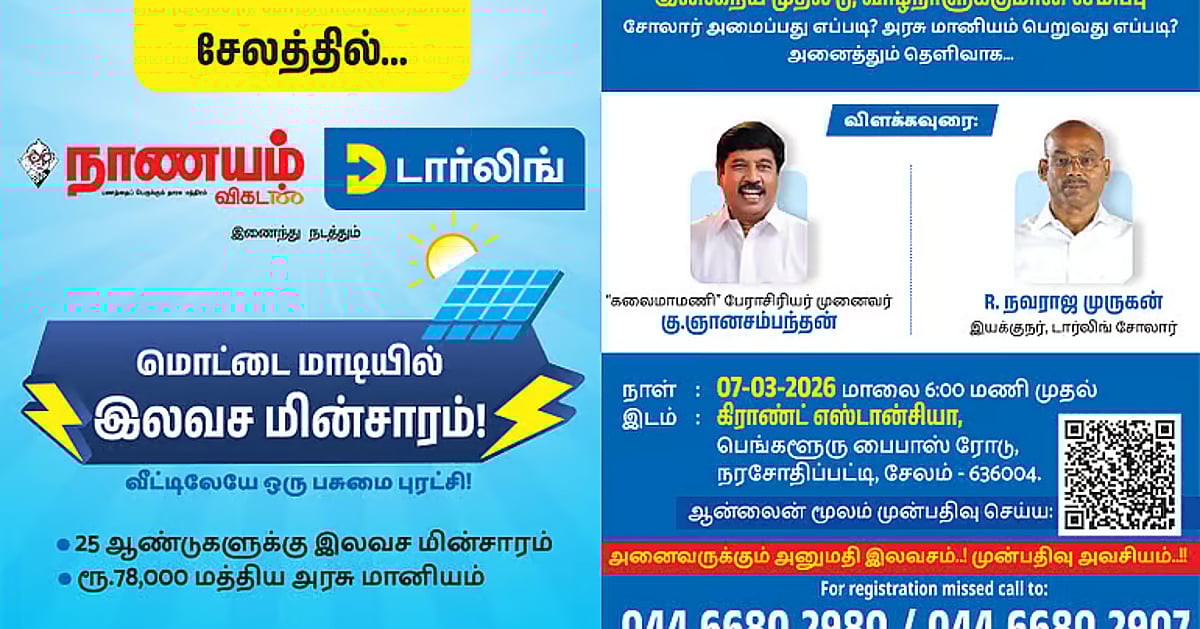 சேலத்தில் வரும் மார்ச் 7-ம் தேதி சனிக்கிழமை நாணயம் விகடன், டார்லிங் சோலார் இணைந்து சோலார் விழிப்புணர்வு நிகழ்ச்சியை நடத்த உள்ளது. இந்த நிகழ்வில் கலந்துகொள்ள அனுமதி இலவசம்.