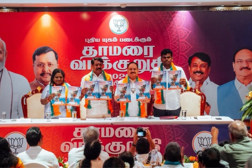 இந்த நிலையில், சென்னை பாஜக அலுவலகத்தில் அக்கட்சியின் தேர்தல் அறிக்கையை மத்திய அமைச்சர் ஜெ.பி. நட்டா இன்று காலை வெளியிட்டார். இந்த நிகழ்வில், பாஜக மாநில தலைவர் நயினார் நாகேந்திரன், மூத்த தலைவர்கள் தமிழிசை சௌந்தரராஜன், அண்ணாமலை உள்ளிட்டோர் கலந்துகொண்டனர். இந்த தேர்தல் அறிக்கைக்கு ‘புதிய யுகம் படைக்கும் தாமரை வாக்குறுதி 2026’ என்ற பெயரிடப்பட்டுள்ளது.