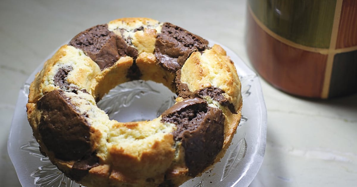 பின்னர் இதனுடன் சலித்துவைத்துள்ள மாவைச் சிறிது சிறிதாகச் சேர்த்து கலந்து நன்றாகக் கலக்கவும். பிறகு இதை இரண்டு பகுதிகளாகப் பிரிக்கவும். அதில் ஒரு பகுதியில் கோகோ பவுடரை கலந்து நன்றாக மிக்ஸ் செய்யவும். கேக் பானில் வெள்ளை மாவையும் கோகோ கலந்த மாவையும் மாற்றி மாற்றி ஊற்றவும். இரண்டு மூன்று முறை பானை நன்றாகத் தட்டி சமப்படுத்தவும். பின்னர் இதனை பிரீஹீட் செய்த ஓவனில் வைத்து 35 முதல் 40 நிமிடங்கள் அல்லது கேக் நன்றாக பேக் ஆகும் வரை வைத்து பேக் செய்து எடுக்கவும்.